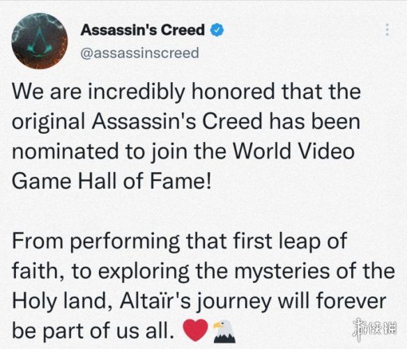 ? ? ? ?《刺客信条》官方推特宣布,2007年发行的《刺客信条1》获得2022年度“世界电子游戏名作堂”(World Video Game Hall of Fame)最终提名。